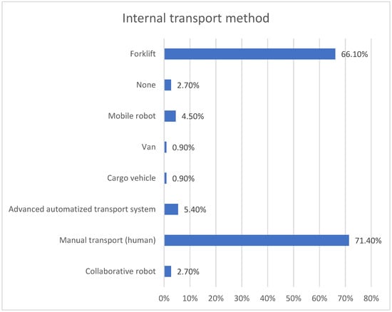 The survey (available in Supplementary File S1) was structured to have four parts. In the first part, the basic information about the manufacturer was collected, such as the company size, years of active presence on the market, number of participant’s work experience years within the current company, and whether the green technologies and the use of renewable energy sources are part of the corporative brand and strategy. The second part of the survey was related to the current level of digitalization and general use of Industry 4.0/5.0 technologies. Familiarity with Industry 4.0/5.0, current level of digitalization within the company, challenges in the digitalization process, as well as the current use of green technologies, renewable energy sources, and interest for green technology implementation were examined. In the third part, the participants had to answer questions regarding digitalization and green technology implementation in internal transport, while, in the fourth part, the questions were based on green technologies’ implementation and digitalization in the activities of external transport. Besides that, safety and the influence of human workers on those activities were also examined, being related to the human-centricity of Industry 5.0 concept. Two types of questions were proposed to make results relatable to the previously conducted research found in the literature and described in Section 2 and the previous work by the authors [65,66,67,68]. Questions regarding the existence of green and digital elements in the company were proposed with predefined answers, while the evaluation of the current level of the digitalization and green principle use is proposed on a Likert scale (1–5) for the easier perception of the user [70]. Also, based on previous experience [65,66,67,68], the rankings were made simple for the user in terms of equal number of elements and rank numbers. The data were collected in March 2023, while the statistical analysis was provided by IBM SPSS v27 software.