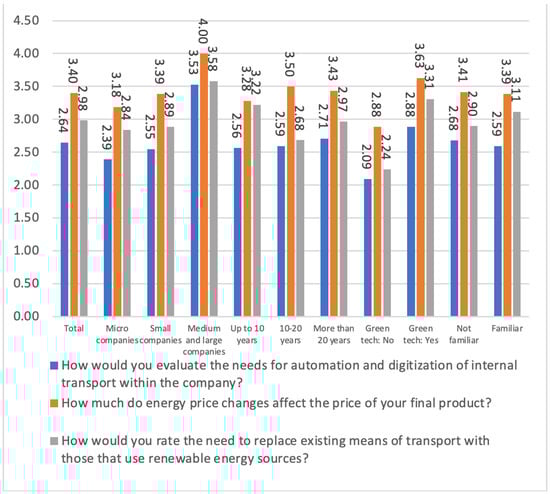 The most important element of electric transportation perceived is environmental awareness (4.19). In companies with green strategy, the highest importance was given to environmental awareness and sustainability (4.15), while those with no green strategy mention profitability as the most important reason. Those familiar with Industry 4.0 gave the highest priority to environmental awareness, while those unfamiliar with Industry 5.0 consider profitability to be the most important element (3.84).