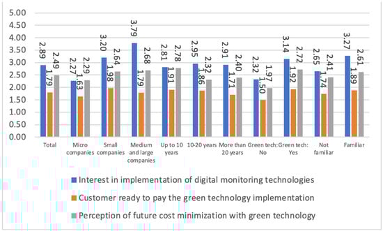 The average grade of interest of companies in digitalization is 3.47 (where 1 is the lowest and 5 the highest level). Those without green corporate strategy (2.71) have the lowest average interest, while the highest is shown by medium and large enterprises (3.95). A significant difference is noticed in familiarity with Industry 4.0/5.0, p = 0.005. The average grade of personal approximation of the current level of digitalization within the company is 2.82, where the highest rate is shown by those with green tech strategy (3.0), while the lowest, again, by those without green tech strategy (2.41), with a significant difference proven by p = 0.005. A significant difference has been noticed in the group of company size between medium/large (3.42) and micro companies (2.63), p = 0.016.