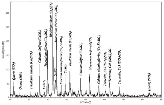 The cement composition was analyzed at 25 °C using XRD (Figure 3). The sample holder was packed to within 3 mm of its capacity with 2 g of cement powder. The XRD was evaluated at intervals of 0.02 from 10 to 90°. Scanning electron microscopy (SEM) was used to obtain information about the cement’s morphology (Figure 4).