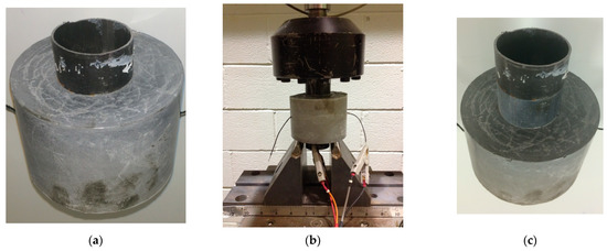 Figure 5 depicts the experimental setup to evaluate the shear bonding between the steel casing and the cement. The steel casing was loaded up until it was flush with the cement. At a w/c of 0.38 and curing times of 1, 7, and 28 days, the applied load pushed the steel casing through the cement sheath. A portion of the steel enclosure was shifted aside (dia.: 45 mm; height: 74 mm). The load was applied to the steel casing until it reached the cement level (Figure 5b). The applied load pushed the casing through the cement sheath. Figure 5c shows the specimen at failure. The steel casing was moved to one side. After debonding from the cement sheath, the applied load acted against the friction between the steel–cement interface.