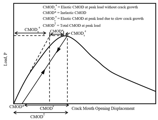 Since the effective crack length was the sum of the initial notch plus an effective crack extension at the peak load, it can be mentioned that if the material behaved elastically up to the peak load without any crack extension, the relationship between the load and CMOD would be linear. However, suppose any displacement occurred due to unloading the specimen just before and immediately after the peak load. In that case, the displacement could be considered an inelastic displacement associated with the response of the notched beam. Studies have indicated that at peak load, the total CMOD () is composed of the elastic displacement (no crack extension—), inelastic displacement (), and elastic displacement due to slow crack growth ().