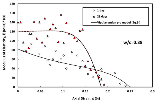 By differentiating Equation (8) and using the same p and q parameters for the stress-strain models in Equation (8), the modulus of elasticity of the cement paste versus strain can be predicted using Equation (9) (s is the axial stress, σf and εc are the stress at failure and the corresponding strain, and p and q are model variables (Table 1)):