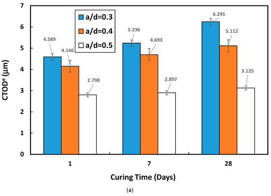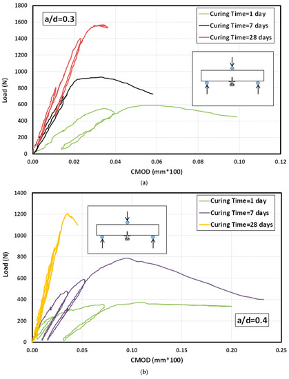 Figure 11 displays the load versus CMOD for each a/d at three curing times. The was reduced by 39% when the a/d was increased from 0.3 to 0.5 (Figure 12a), and the value of the increased by 11 to 36% when the curing time was increased from 1 to 28 days at the same a/d. Figure 11 depicts a linear relationship between the load and CMOD, assuming the material exhibited elastic behavior up to the peak load without any crack extension. This inelastic displacement (CMOD*) abruptly released the specimen after the peak load. The elastic displacement (no crack extension—), inelastic displacement (CMOD*), and elastic displacement due to slow crack growth at maximum load made up of the CMODT (). The specimen was unloaded at 95% of the peak load to obtain the total elastic CMOD ( = + ). Figure 12a,b shows the relationships between curing time and COMDe and KI of oil well cement at three different a/b, respectively.