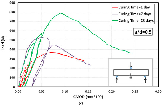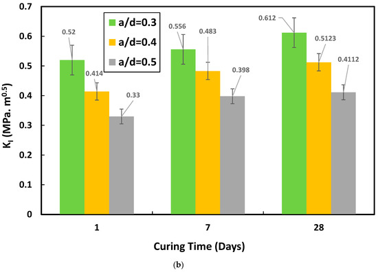 The KI increased as the notch-to-depth ratio grew (Figure 14b). In this study, the KI ranged from 0.33 to 0.612 MPa.m0.5. The results of this study were consistent with previous reports that the KIC of cement pastes, cement mortars, and cement concretes can range from 0.1 to 1.7 MPa.m0.5. It was hypothesized that the wide variety of KI values was due to the variations in the material that caused scatter in experimental results and the limitations in the applicability of fracture mechanics concepts. The KI of the cement paste decreased with the ratio of a/d; also, the KI increased from 0.33 at 1 day of curing to 0.398 and 0.4112 MPa.m0.5 when the curing time was increased to 7 and 28 days, respectively.