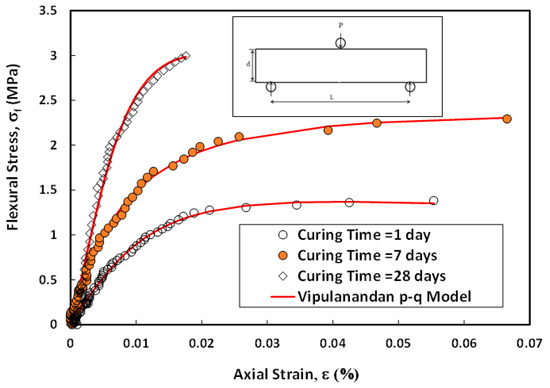 Equation (1) was used to model the flexural stress–strain behavior of the cement with a w/c of 0.38 up to 28 days of curing. When the cement was left to cure for 7 days, there was a 12% increase in flexural strength compared with 1 day of curing. After 28 days, there was a 15% increase in flexural strength compared with 7 days of curing, as shown in Figure 13. The Vipulanandan p-q model performed well in predicting the experimental data, with R2 and RMSE values between 0.99 and 0.98 and 0.03 and 0.03 MPa, respectively (Table 1).