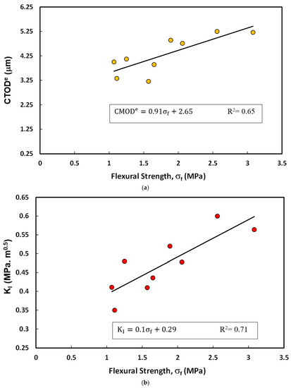 The following correlations were developed between the CTODe and KI with the flexural strength ( of the cement paste (Figure 14):