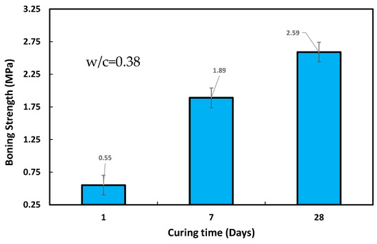It is essential to consider not only short-term well integrity factors such as cement quality and pumpability at the time of cementing operation but also the long-term integrity of the cement sheath, including the cement/casing bonding throughout the well’s life and developing a high bonding strength between the cement and steel. The casing between the cement and the formation on the other side is an essential property determining the life of oil and gas wells. This new protocol test measured the bonding strength between the steel tube and the oil well cement at three curing times (1, 7, and 28 d). The respective bonding strengths were 0.35, 1.39, and 3.59 MPa for the three curing times (Figure 15). The steel casing was moved to one side. After debonding from the cement sheath, the applied load acted against the friction between the steel–cement interface. Mechanical properties were tested by conducting compression, indirect tension, flexural, fracture toughness, and steel casing–cement bonding tests.