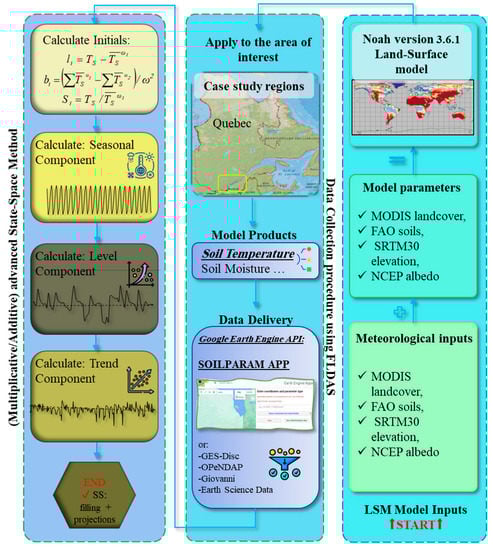 The objectives of this paper are (a) to introduce an extraction method for the collection of monthly mean TS data for two agricultural areas in Quebec, Canada and (b) to apply the powerful SS method for modeling. Following these are (c) a spatial validation analysis will be carried out to analyze the model’s accuracy alternation and pattern evaluation in case a time series of different locations are used, and (d) a trend and long-term alternations analysis of the TS variable will be carried out based on the model results and forecasts. Finally, (e) the results of the proposed FLDAS–state-space method will be comprehensively discussed in the following sections. Furthermore, this paper will outline the practical application of these results, including their integration into future TS forecasts, thereby making a significant contribution to the field.