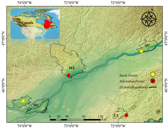 To validate the results of the proposed methodology, the soil temperatures at two other locations were obtained, using the same method as the GEE API. These locations were selected based on the mapping of the land use of the St. Lawrence Lowlands report, published by Environment and Climate Change Canada in 2018. The Mauricie (MA) validation point is located between the first two study points (QC and MC), and the second validation point Lennoxville (LX) is located east of these points. These locations are two critical agricultural areas in Quebec, Canada. They are located between and southeast of the previous ones (Figure 2).