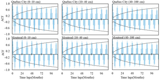 In order to retrieve the soil temperature data from the FLDAS, a set of commands was coded using the GEE API. The extracted time series were tested for stationarity, and the results are presented in Table 1 for Quebec City and Montreal, respectively. Since the focus was on the study points, and the validation points followed the same pattern, the results of these points are not presented. The SMK test results show significant seasonal trends in both TS time series. For each soil layer (there are 3 layers with the following upper–lower depths of 0–10, 10–40, and 40–100 cm), the probabilities corresponding to the MK and MW test results are higher than the significance level of 5%. Thus, the presence of non-seasonal trends and jumps in the datasets are not significant. Figure 6 shows the ACF plots of all the series. The seasonal correlations can be seen as sinusoidal patterns, with peaks at lags 12, 24, 36, 48, 60, 72, and 84, equivalent to 7 seasonal lags with a repetition of 12 months. In these lags, the ACF values are higher than the 95% confidence interval, and therefore, these correlations are considered significant. They are found at all soil depths. Considering the significant periodicity that could be observed and the presence of a seasonal trend, the KPSS test failed to detect the impact of these non-stationary factors properly. All probability values for this test are higher than a significance level of 5%. It additionally indicates the importance of utilizing several tests for stationarity detection. In other words, by using the MK and SMK tests, the significance of the gradual changes over time was assessed. According to these results, these incremental changes were only significant seasonally. As the MW test demonstrated, no sudden changes were detected in the datasets.