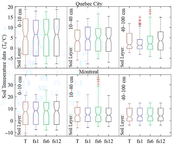 Alongside assessing the models using indices such as R2, RMSE, etc., the statistical features of the forecasts should be evaluated. Appropriate models should additionally reproduce the statistical characteristics of the original data [55]. To investigate the reason for drops in accuracy and evaluate the statistical aspects, box plots of forecasts vs. observed data were drawn (Figure 7). Some outliers were observed in QCTSs (40–100 cm) and TS Ts (10–40 cm). These outliers were the reason for poor results at these depths and were created because of some extreme values in the level component during the training period. These extreme values were multiplied by the SS relationship’s seasonal factor and seasonal coefficients. The interquartile areas and means of the TS data in the Montreal time series were almost perfectly reproduced. However, these features for the Quebec City time series fluctuated by a few degrees centigrade.