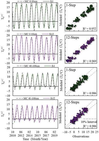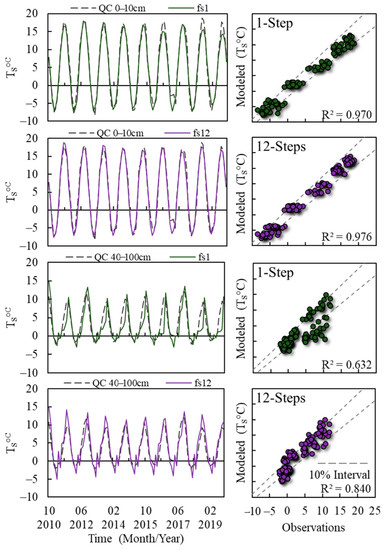 Three types of modeling were conducted to examine the SS method’s modeling capability. The first was dynamic modeling, where the model was updated after each forecast. Next, a 6-step-ahead forecast (fs6) was performed, followed by a 12-step-ahead forecast (fs12) that covered the entire period. The results of the 1-step-ahead forecast (fs1) models are provided in Table 2. As seen, the SS model could forecast the test period with a coefficient of determination higher than 0.90 and with low and relatively close errors, except for the 40–100 cm depth in Quebec City. Additionally, a decreasing trend in the accuracy by increasing the depths was observed.