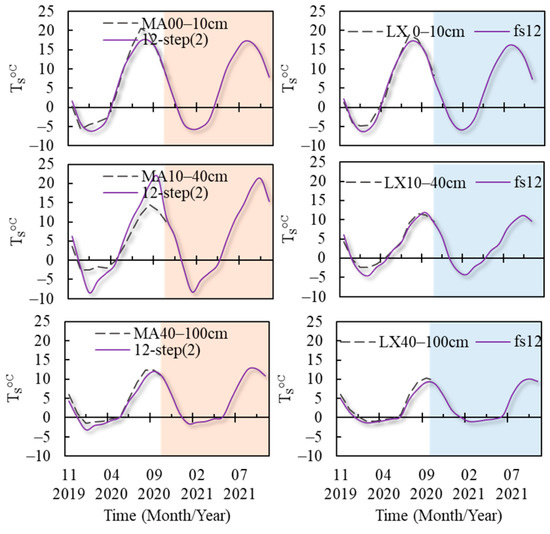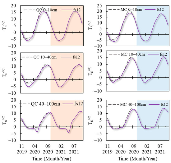 Table 3 and Table 4 present the modeling results for the fs6 and fs12 modeling methods. As the soil depth increased, a general decline in accuracy could be seen, except for the first soil layer (10–40 cm) for both fs6 and fs12. At this depth, the accuracy was lower than in the other two depths. According to the results, there are some variations in the magnitude of the errors with a maximum value of ~3 °C. For all depths, the average difference between forecasts and observations was ~2 °C except for Montreal (10–40 cm). For the Quebec City modeled time series, all sudden drops in accuracy were observed deeper in the soil profile (40–100 cm). A decrease in model accuracy was additionally observed in the Montreal model results. However, this reduction in accuracy of the first soil layer (10–40 cm) is more significant than that of the second (40–100 cm), in contrast to the Quebec City model results, which had a uniform trend in accuracy reduction. The Nash–Sutcliffe coefficient additionally demonstrates the power and efficiency of the generated model in forecasting shallow depths. This sudden decline is due to extreme changes in the level component of the SS model, and the model could not adequately adapt over that period. Furthermore, the parameters are not optimized properly. The TS datasets are highly periodic, and the SS seasonal parameter was expected to have a greater weight in the equation. However, on the contrary, for the middle soil layer in Montreal (10–40 cm), the involvement of the seasonal parameter in the model equation is less than the other 2 parameters.