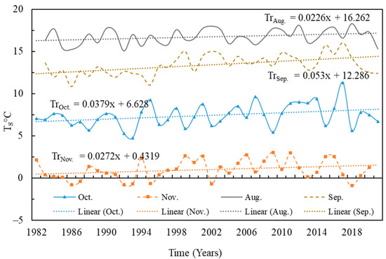 It was mentioned that a significant seasonal trend exists in these time series. The monthly values of different years were separated from the series to exhibit this seasonal trend and assess its significance. The MK test was then applied again. The test results indicated a trend in each month of the TS time series, some of which are significant. In Quebec City, the months of August, September, October, and November and in Montreal, September, October, and November had a significant positive trend for different soil layer depths. Each location had a positive trend for seven months of the year. This means that the soil is generally getting warmer. Figure 11 presents the time series of the first soil layer (0–10 cm) for August, September, October, and November in Quebec City, along their linear trend lines, as examples of the progressive warming in the TS time series.