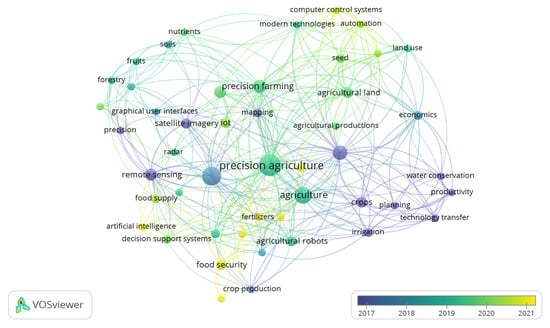The implementation of PA has spread across Europe and America. In the UK and Ireland, the adoption of PA still needs to grow []. Technology implementation is spread unevenly and compared to the US and Australia, implementation in the EU is lower []. Katalin et al. [] predict pesticide use savings on PA adoption in the EU saving on fertilizers used. A study conducted in Ontario, Canada regarding the profit mapping method in agricultural management, but was less than optimal, resulted in economic losses []. Figure 1 and Figure 2 indicate that there is a research gap in Indonesia. This analysis is intended to evaluate Indonesia’s future PA research by increasing collaboration with developed countries that are successful in PA applications so that Indonesia can develop its agriculture properly and ensure food security.