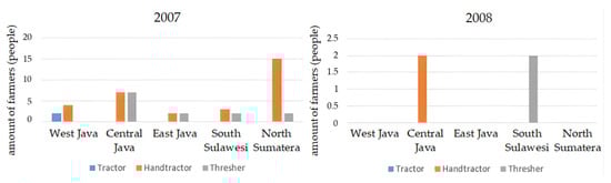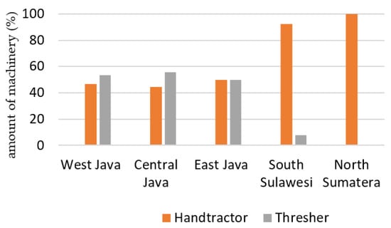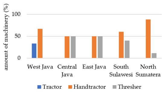 Figure 6 illustrates the distribution of ownership for agricultural tools and machinery in 2007 in Indonesia’s rice field agro-ecosystem in five main areas. The dominant agricultural tools and machines used are small tractors and threshing machines. North Sumatra has the highest use and ownership of small tractors, while other areas have a balanced proportion of tractors and threshing machines. West Java is the only area with large tractors in the five regions. However, in 2008, the data obtained were from small tractor ownership in Central Java and agricultural machinery in North Sulawesi with the secondary crop agro-ecosystem.