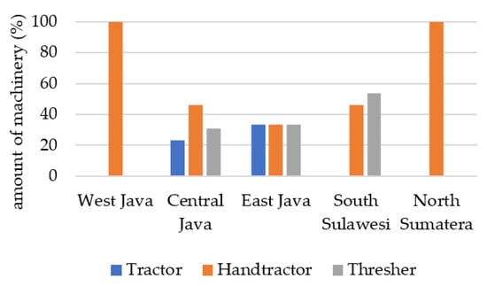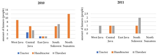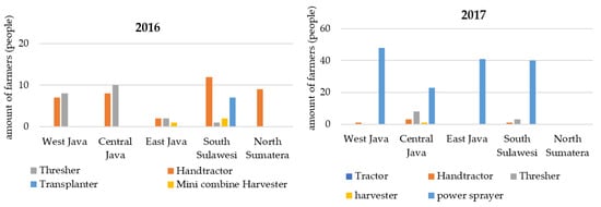In 2016, there was the adoption of technology, proving that farmers have begun to realize the benefits of technology in increasing agricultural productivity. Threshing machines are quite effective, forming a better, cleaner quality of rice. The use of technology can shorten the time in harvesting []. Figure 10 shows the ownership of tools and machines in 2016 and 2017, an increase in the type and quantity of agricultural tools and machines used; in 2016 all regions tended to use small tractors and threshing machines, while in 2017, there were more power sprayers used in the region, especially in West Java, Central Java, East Java, and South Sulawesi.