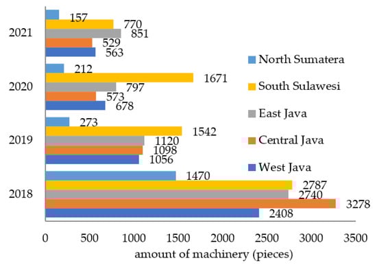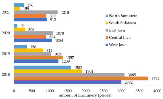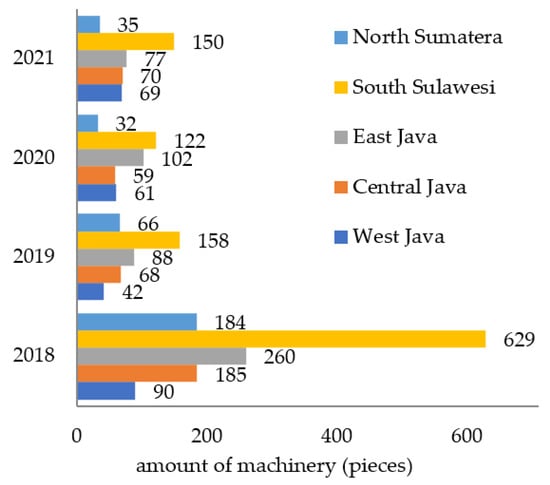 Technology development in facilitating agricultural activities has changed from 2007 to 2017. The use of tractors has shifted from the existence of large tractors to the use of small tractors. As of 2007, large tractors are still in use in some areas. It needs to be seen in the following year as an illustration of the community’s response to mechanization. This use indicates a change in the scale of agriculture, where household farms have replaced large farms in the 2018–2021 period (Figure 11 and Figure 12). Large tractors have greater mechanical power and are capable of cultivating larger agricultural land. Large tractors are considered ineffective when agriculture in Indonesia has undergone a size change to become a small-scale farm. In 2017, in every Indonesian region in Indonesia, large tractors were almost nonexistent. They were replaced with small tractors because small-scale farming uses small tractors that use simpler machines and lower costs, either from fuel use or maintenance (Figure 8). Figure 9 shows the highest mechanization in South Sulawesi in 2018 for large tractors compared to other provinces. It is interesting because it is in line with Indonesia’s vision as a food source, so the food estate program is focused on the clearing marginal land that requires many tractors. The substitutability of peatland as a food estate is needed to prepare canals, irrigation construction, and rice field designs [].