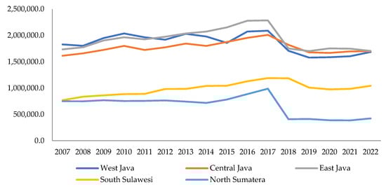 The panel data used were National Farmers Panel data (PATANAS) for 2007–2018 for the five main rice-producing provinces at that time, namely North Sumatra, West Java, Central Java, East Java, and South Sulawesi. The number of samples used was as many as 252 households spread over five areas of rice production centers in Indonesia. The variables analyzed in this study were control of agricultural assets in rice farming, such as ownership of pre-harvest and post-harvest agricultural equipment and machinery, including tractors, hand tractors, threshers, transplanters, and mini combine harvesters. PATANAS is the household data of farmers from the census and survey of the Ministry of Agriculture Indonesia. PATANAS covers rural research in various provinces in Indonesia. Hence, the secondary data obtained by PATANAS have comprehensive coverage and are quite accurate as material for writing scientific papers. Operationally, PATANAS can be used, among other things, to measure agricultural production parameters, measure the effectiveness of government policies to increase information quickly, and adopt future agricultural production systems for data agriculture mechanization in 2018–2021 using data from the Directorate General of Agricultural Infrastructure and Facilities, Ministry of Agriculture Indonesia [].