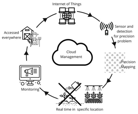 Technologies such as artificial intelligence (AI) and the internet provide solutions to face the challenges of globalization. PF is based on the IoT []. IoT can link sensor devices to collect data. The utilization of technology aims to obtain the right environmental condition data to be analyzed for decision making (Figure 16). IoT will find the possibility of bad things happening to plants, such as pest infection []. It will help farmers to produce more rice production. IoT for farmers can reduce fertilizer use by up to 70%, depending on the type of commodity and land conditions []. In addition, farmers can also know the weather conditions so that fertilization is optimal [].