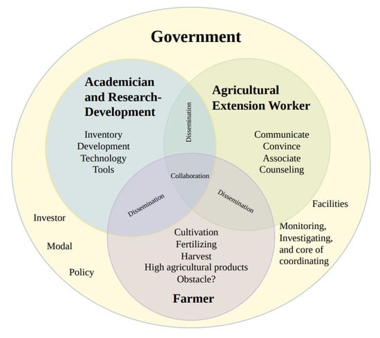 Small farms that are homogeneous can combine to implement PA technology together (communally). Maximizing the adoption of PA for both large and small farmers aims to increase yields, reduce environmental impacts, and improve the economy. The top-down method is applied more to link the effectiveness of interaction and farmer acceptance []. As the highest authority, the government can regulate and bind the farmers, acacia, research development, and agricultural extension workers through planning and promoting sustainable development by PA. The implementation has been applied to farmers, but stakeholders still need support in its direct implementation [], so there is no binding obligation on adoption. The involvement of stakeholders in technology diffusion is important for conservation, and social and economic goals []. According to Kanter et al. [], to overcome farmers’ low adoption of precision, the government has contributed to policymaking and institutional changes in adoption.