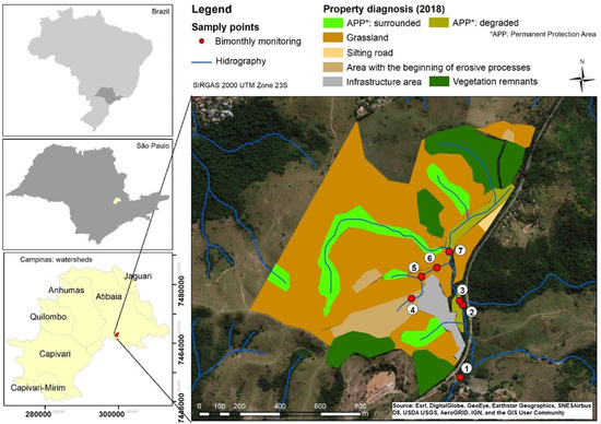 The present study was developed from the results obtained in a case study carried out on a rural property participating in a payment for environmental services (PES) program with a water focus in the municipality of Campinas, in the state of São Paulo, Brazil. The region is influenced by the tropical Atlantic and continental and polar Atlantic air masses and is classified as Cfb (temperate with mild summer), Cfa (subtropical with hot summer), and Cwa (subtropical with dry winter and hot summer) under the Köppen climate classification system. The rainy season starts in the spring, especially in October, and lasts until mid-April with a peak in the summer and a drought from May to September, so that the precipitation values are between 1200 and 1800 mm annually [23,24].