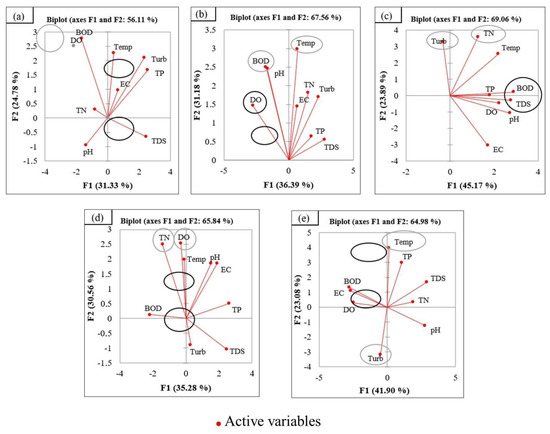 PCA factor load: (a) April 2019, (b) July 2019, (c) September 2019, (d) November 2019, (e) January 2020. F1 and F2-components; DO-dissolved oxygen, BOD-biochemical oxygen demand, Turb-turbidity, Temp-temperature, EC-electrical conductivity, TDS-total dissolved solids, TP-total phosphorus, and TN-total nitrogen. Black circles-association with F1 (Component 1) and gray circles-association with F2 (Component 2).