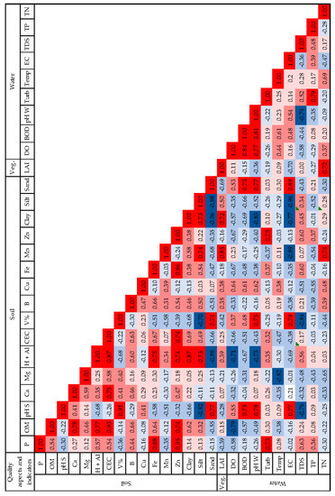 Figure 3 shows the Pearson coefficient obtained for the analysis of the correlation between the aspects of soil, water, and vegetation. Blue cells represent a negative correlation while red ones a positive correlation and the more vivid the color, the greater the coefficient.