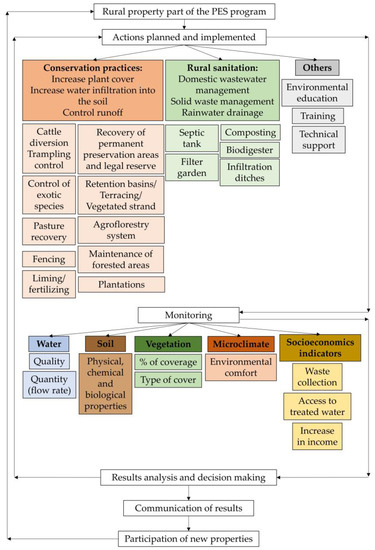 The Customized Property Program under the PES defined goals and actions that are subdivided into four blocks: (i) forest code, which covers the legal obligations for forest restoration and protection of native vegetation; (ii) rural sanitation, which deals with domestic effluent management and rainwater drainage actions; (iii) soil conservation, which relates to the implementation and maintenance of soil conservation practices; and (iv) granting the use of water resources.