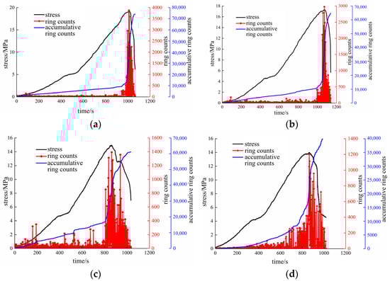 In addition, from Figure 3c–e, it can be seen that after the 10, 20, and 30 freeze–thaw cycles, the sandstone has obvious acoustic emission signals before 900 s. With increased freeze–thaw cycles, the ring count also increases, which indicates that the freeze–thaw action aggravates the initial damage of sandstone at the mesoscale. At the same time, it is found that when the peak stress is reached, the internal cracks of the rock are penetrated, and a large number of acoustic signals are generated while the rock sample is destroyed, and the ring count rises sharply. The period of a sharp increase in ring count is consistent with the peak stage of rock failure. Therefore, the sharp increase in the ring count can be regarded as a sign of freeze–thaw sandstone failure.