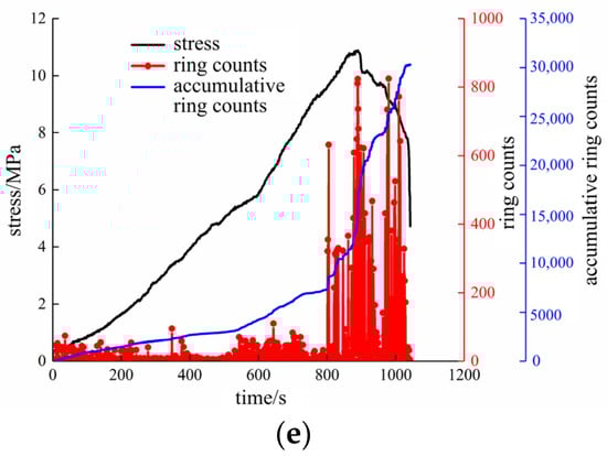 Variation of stress and ring count of freeze–thaw sandstone overtime during the compression process: (a) 0 times, (b) 5 times, (c) 10 times, (d) 20 times, and (e) 30 times.