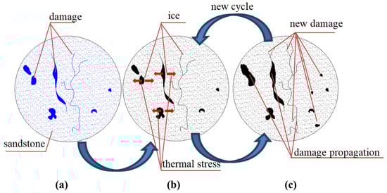 The mechanism of the influence of freeze–thaw cycles on the variation of acoustic emission characteristic parameters is shown in Figure 4. Pores and cracks naturally occur in sandstone (Figure 4a,b). When sandstone is in a water-rich environment, the water enters the pore network until it is fully saturated. In the freezing process (Figure 4b), the water in the pores freezes, which results in volumetric expansion and frost heaving. The pore ice formed from the pore water expands by approximately 9% and can generate significant frost heave stress. If more than 90% of the pore volume is filled with water, expansion of the water during freezing will cause pressure. This stress acts on the pore walls, and when the pressure exceeds the tensile strength of the rock, cracking occurs and the pore walls are destroyed, potentially propagating the existing crack tips. This is illustrated in Figure 4c, which shows the expansion and elongation of existing cracks. In addition, the effects of low temperatures can cause thermal stress, which can initiate new cracks oriented perpendicular to the existing cracks (Figure 4a). Therefore, under low-temperature conditions, frost heave and thermal stress are the leading causes of damage to sandstone structures. Under repeated frost heave, deformation occurs, and such deformation cannot be restored during the melting stage. Therefore, the damaged structure within the rock sample continues to evolve and expand. Under compressive loads, changes in the microstructure inevitably result in changes in the acoustic emission parameters.