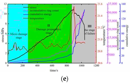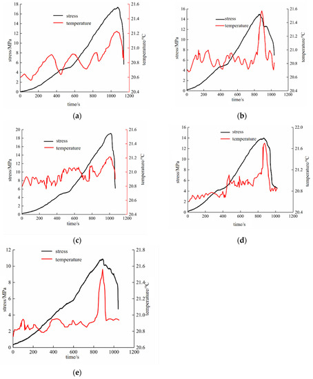 Average temperature–stress–time curves of freeze–thaw sandstone during the compression process: (a) 0 times, (b) 5 times, (c) 10 times, (d) 20 times, and (e) 30 times.