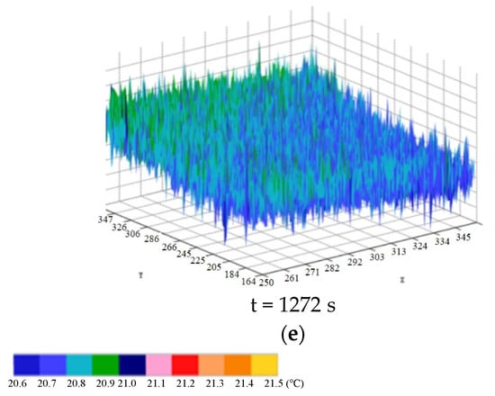 Three-dimensional images of infrared thermal image evolution during compressional damage in freeze–thaw sandstone: (a) 0 cycles, (b) 5 cycles, (c) 10 cycles, (d) 20 cycles, (e) 30 cycles.