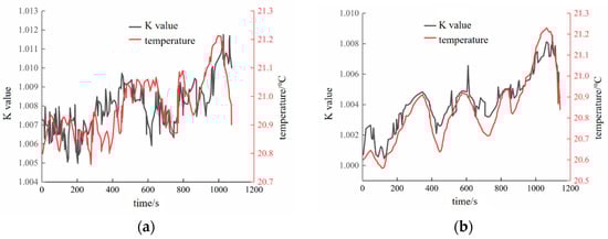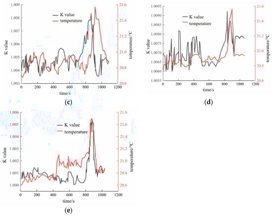 According to Equation (10), the K–temperature–time curve during the failure process of freeze–thaw sandstone can be obtained (Figure 7). After performing statistical analysis, Table 1 was obtained. It can be seen that in the whole process of loading until failure, the value of early warning index K is consistent with the changing temperature trend. When the overall temperature of the rock changes little, K tends to be stable, and the value will increase significantly in the first few seconds of the sudden increase in temperature. It can be seen that the early warning index has a consistent change trend with the temperature change but has a certain advanced appearance, which can better realize the extraction of information about thermal infrared damage to freeze–thaw rock.