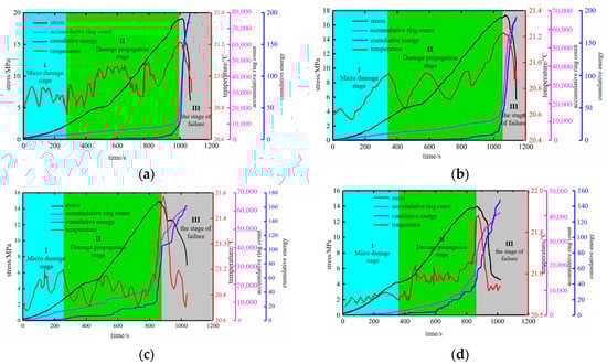4.2. Temperature–Stress–Time Variation during Compression Failure Process