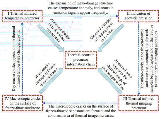 In the process of freeze–thaw sandstone compression failure, with increasing freeze–thaw cycles, the precursor characteristics become increasingly obvious. The precursor information chain links the acoustic–thermal precursor information in the process of freeze–thaw sandstone damage under load and constructs a relatively complete precursor information warning chain in time and space. This information chain can provide warnings about damage to the rock in time and space. The thermal infrared temperature and acoustic emission precursor information can be used as the early warning in the information chain, in order to prioritize warning of damage to freeze–thaw rock samples in time. The precursor thermal image anomaly and macroscopic crack propagation information can be used as a later warning for the potential fracture position of rock in space.