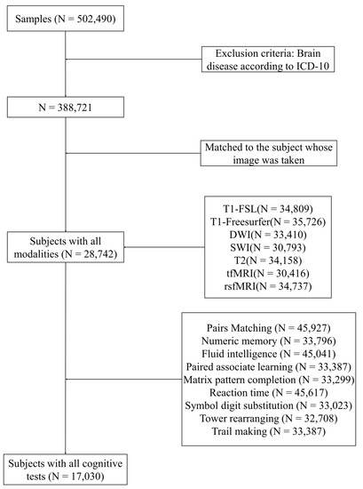 Data utilized in the present study were drawn from a population-based prospective cohort study, the UK Biobank (UKB) [20]. This extensive study comprises a significant number of individuals, aged middle to old, exceeding 500,000 in total, and seeks to investigate the underlying causes of complex diseases affecting this age range [21]. Ethical approval for the study was granted by the North West Multicentre Research Ethics Committee (REC reference 11/NW/0382), and the UKB (application number 68382) had provided approval for the study’s implementation. Standardized questionnaires were used to collect participants’ comprehensive lifestyle information during in-person interviews. Additionally, cognitive function assessments were implemented using a touchscreen questionnaire. As part of the UKB’s research efforts, brain imaging data from a subset of participants was collected. The brain imaging data were collected approximately eight years after their baseline information was initially collected. To ensure the eligibility of participants, a rigorous screening process was implemented, as illustrated in Figure 1. Exclusions were made based on diagnoses classified according to the International Classification of Diseases, Tenth Revision (ICD-10), with individuals displaying malignant neoplasms of the eye, brain, and other parts of the central nervous system, cerebrovascular diseases, mental and behavioral disorders, diseases of the nervous system, and other conditions that impact brain health being excluded from the study. Out of the initial 388,721 participants, only individuals who had undergone brain scans using all six image modalities were selected. Satisfying this criterion were 27,842 individuals. Subsequently, further screening was carried out by selecting individuals who had completed nine cognitive tests, including pairs matching, numeric memory, fluid intelligence, paired associate learning, matrix pattern completion, reaction time, symbol digit substitution, tower rearranging, and trail making). Finally, following the stringent screening process, a total of 17,030 eligible participants were included in the study.