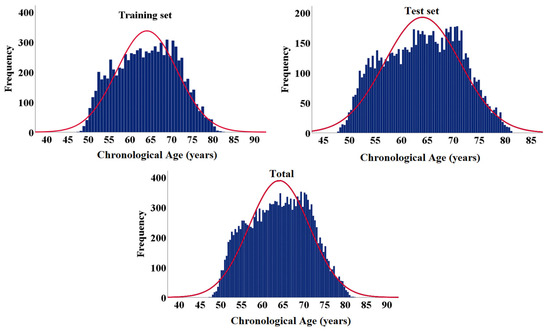 We employed nested cross-validation to estimate the prediction accuracy of the model. To accomplish this, we randomly partitioned the selected samples into two separate and equally sized subsets: a training set and a test set. A five-fold cross-validation approach was used to validate the model for the training set. Table 1 provides a detailed summary of the demographic characteristics of both sets, including key features such as gender and age. Figure 2 displays the chronological age distribution across the training and testing sets as well as the entire cohort.