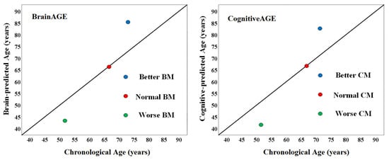 A conceptual representation of BM and CM. The colored dots depict the respective estimated brain age or cognitive age, while the black line represents the corresponding chronological age. The relatively spatial distance between the colored dots and the black line reflects the magnitude of the BrainAGE or CognitiveAGE.