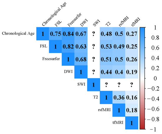 Figure 4 presents a correlation matrix, elucidating the correlation between chronological age and estimated brain age derived from six distinct imaging modalities. The outcome of the evaluation indicated that the highest correlation with chronological age was attained via the utilization of Freesurfer-based features from T1, coupled with a relatively low mean absolute error (MAE). Additionally, the DWI- and FSL-based features from T1 demonstrated a moderately positive correlation with chronological age. Contrarily, the analysis of estimated brain age derived from T2, rsfMRI, and tfMRI revealed a weak or moderately positive correlation with chronological age. It is noteworthy that certain estimated brain age predictions displayed minimal variance, resulting in an infinite correlation coefficient between chronological age and estimated brain age, designated by a “?” in the correlation matrix.