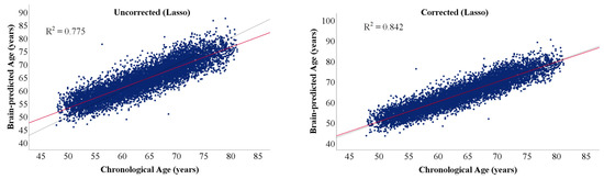 The outcome of the brain age bias correction is exhibited in Figure 5. Post bias correction, the regression line, denoted in red, exhibited increased alignment with the gray line. This result is indicative of the successful correction of age-related bias.