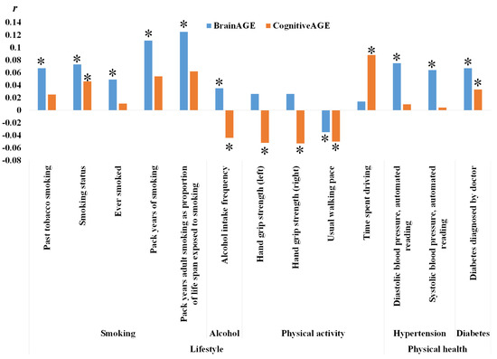 To further study the explanatory power of BrainAGE and CognitiveAGE, a Spearman correlation analysis of BrainAGE, CognitiveAGE, and non-IDPs was conducted. We performed FDR correction on the p-values of these 16 non-IDPs. In all non-IDPs affecting BrainAGE or CognitiveAGE, as long as their adjusted q < 0.01, they were retained for comparison. The correlation r between non-IDPs and BrainAGE or CognitiveAGE is shown in Figure 6. A total of 13 non-IDPs are retained, where * represents q < 0.01.