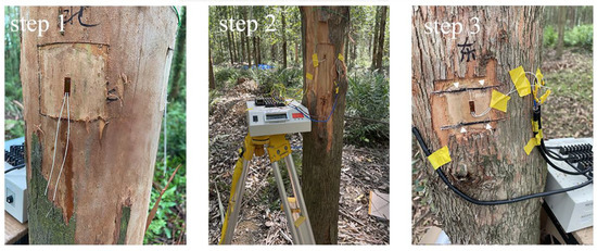 The strain gauge method was adopted by peeling off the bark and cambium (size 4 cm × 4 cm) at the circumference test point at breast height to expose the xylem surface, attaching a strain gauge (BE120-10AA-P150, size 9.8 mm × 3 mm, AVIC Electro-Mechanical Instruments Co., Shaanxi, China) to the xylem surface along the fiber direction (four strain gauges per tree), connecting them to an intelligent static resistance strain gauge (YJW-8/16, Beijing Terra Venus Instruments Co., Ltd., Beijing, China), adjusting the zero, and using an electric drill (drill bit diameter 2.5 mm) to make a hole in the strain gauge at the top and bottom along the parallel line at a depth of 10–15 mm. The strain grows when the reading is displayed on the strain gauge. The reading is taken until the value shown on the strain gauge is stable, and the wire is then removed to test another tree. Measurements were determined in the absence of wind, as recommended by Yang et al. [32], to avoid bending strain overlapping with the growth strain. Testing was scheduled for July 2022. The procedure is shown in Figure 2.