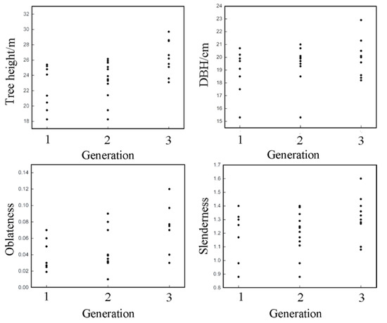 The growth strain in the circumferential position of the tree is influenced by oblateness. Therefore, only the oblateness was analyzed in this section, and the trends of the following four growth traits in continuous planting generations were analyzed by plotting scatter plots of tree height, DBH, slenderness and oblateness by generation (shown in Figure 3). One-way ANOVA and LSD tests (Table 2) were conducted on tree height, DBH, slenderness, and oblateness for different generations to investigate the effects of continuous planting practices on the growth traits of Eucalyptus urophylla × E. grandis.