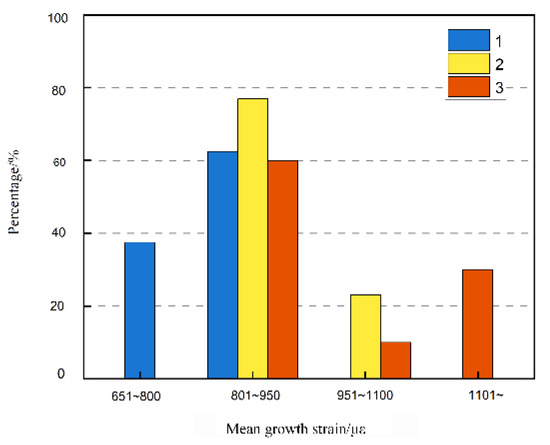 According to the results of existing studies [5,27,28], the average value of the surface growth strain can usually be used to compare and evaluate the surface growth stress of standing trees and logs. Longitudinal growth stress is substantially greater than lateral growth stress and is the main cause of warping and deformation of lumber [14,21], while lateral growth strain values are relatively small; therefore, in this paper, only the results for longitudinal growth strain are analyzed.