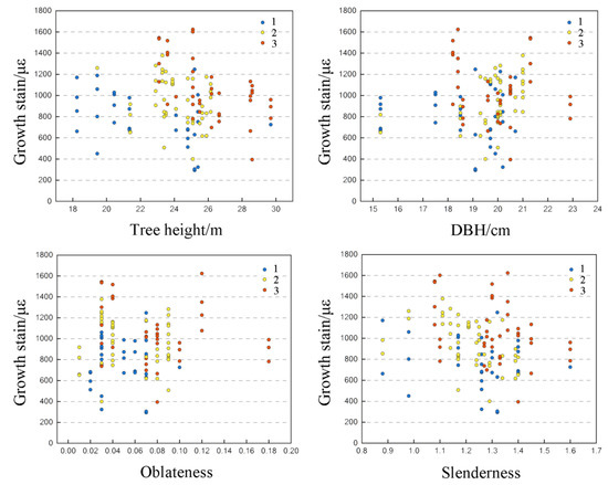 The independent variables affecting the longitudinal surface growth strain of the dependent variable can be divided into two categories. One contains qualitatively described variables such as circumferential relative position (relative position of test points in the circumferential direction, indicated by numbers from 1 to 4), which are collectively referred to as qualitative independent variables in this paper. The other contains quantitatively described growth traits such as tree height, DBH, oblateness, and slenderness. For such continuous independent variables, the visual segmentation function in SPSS 26 software was invoked before ANOVA, and three equal points were inserted into each group of data, i.e., each group of data was transformed into four ordinal values for ANOVA. The resulting independent variables are collectively referred to as quantitative independent variables in this paper. In order to reduce the influence of circumferential relative position on the ANOVA results of other variables, the main effects of all variables and the two-dimensional interaction effects between circumferential relative position and the remaining variables were included in the multi-factor ANOVA model, and the obtained results are shown in Table 3. To further analyze the effects of the respective variables on growth strain, a partial correlation analysis was used for circumferential relative positioning, tree height, and DBH along with ANOVA, and the results are shown in Table 6.