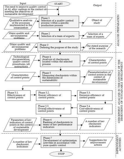 The purpose of the implication of the quality improvement model in the con-text of the idea of sustainability using key indicators is to develop a ranking of total checkpoint efficiencies. This activity will make it possible to propose effective improvement measures. The purpose of the research should relate to defining a change strategy. The change strategy should address efficiency gains to improve the effectiveness of quality control point management and consumption economics. This is possible by ensuring nonconformity-free products, realized via appropriate low-impact technological operations, using stable infrastructure, and under conditions that are friendly to human health. These activities will contribute to conducting clean quality control within the selected production process of aluminum alloy products.