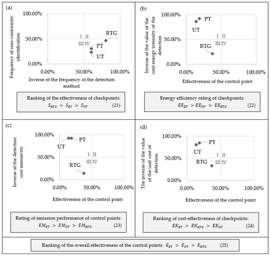 The calculated values of the indicators (efficiency, energy efficiency, emission efficiency, cost efficiency and total efficiency of the checkpoint) of the tested checkpoints were used to develop a ranking of checkpoint efficiency. The desired value was the highest value of the studied parameter.